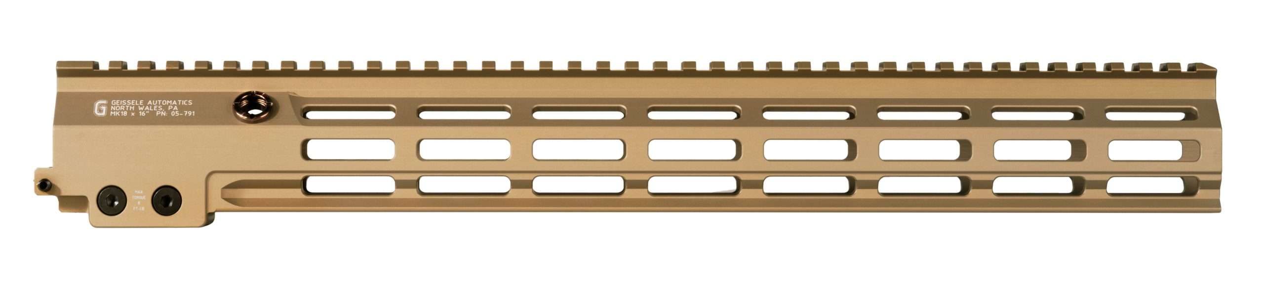 Utilizing Magpul’s M-LOK technology at the major 3 quadrants (left, right and bottom), as well as the upper 45’s gives the MK18 unprecedented modularity and ability to be customized. The MK18 Super Modular rail is finished in a durable and long lasting Type 3 Hardcoat Anodize available in either Black or Geissele’s DDC finish.